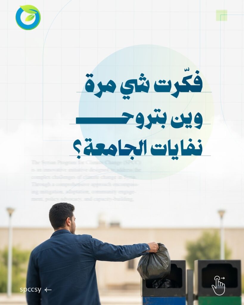 يُطلق البرنامج السوري للتغير المناخي (SPCC) مبادرة توعوية جديدة موجهة لطلاب الجامعات السورية، لفتح نقاش جماعي حول إدارة النفايات وأهمية الفرز من المصدر داخل الحرم الجامعي. سيقوم فريقنا الميداني بزيارة جامعة حلب لعرض سلسلة سلايدات توعوية عبر QR CODE بهدف تسهيل الوصول وتقليل استخدام الطباعة والكرتون حفاظاً على البيئة . ندعوكم لمشاركة آرائكم وتوصياتكم في […]